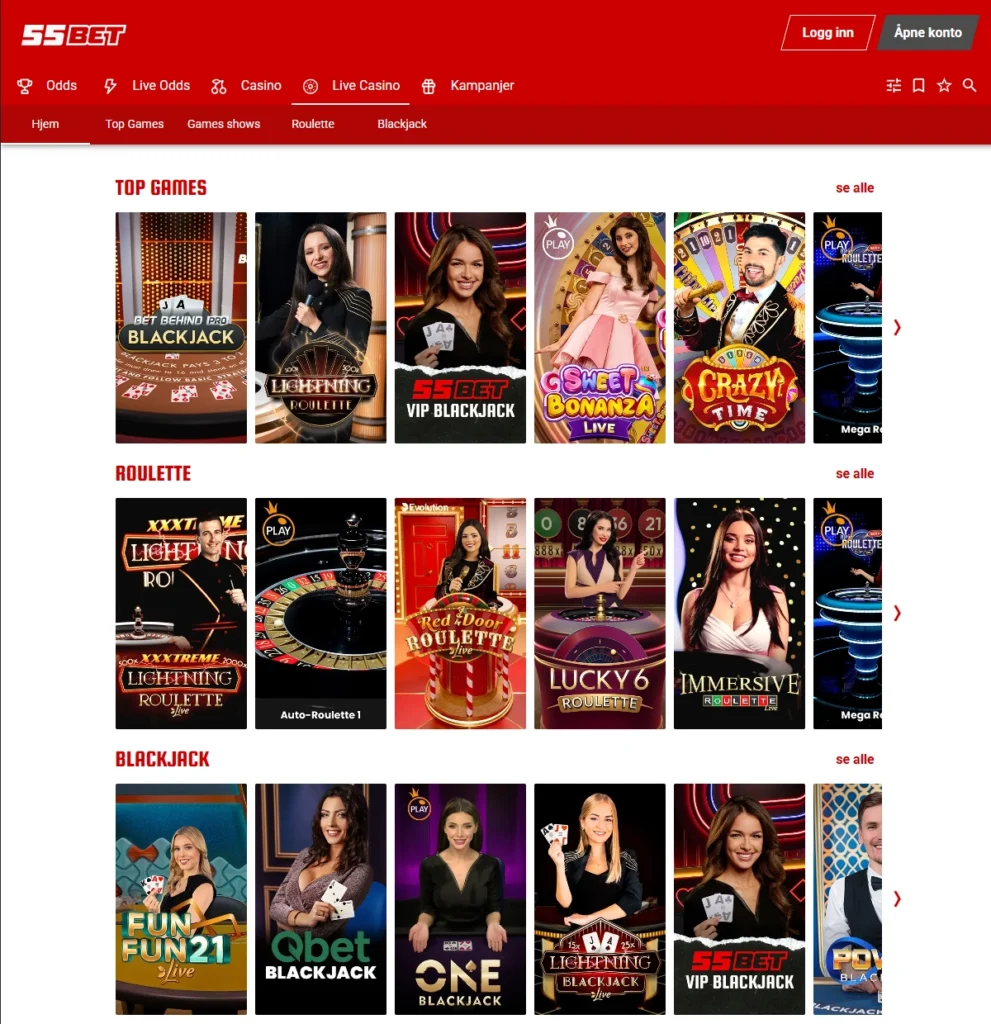 55BETs tilbyr livespill med live-dealere, direktesendt i HD. Du kan velge mellom klassikere som blackjack, rulett og baccarat, men også spennende Game Shows. Brukervennlige menyer gjør det enkelt å finne riktig bord og innsatsnivå, enten du foretrekker lave eller høye innsatser. I tillegg blir du møtt av kunnskapsrike og profesjonelle dealere, noe som skaper en autentisk atmosfære som minner om fysiske kasinoer.