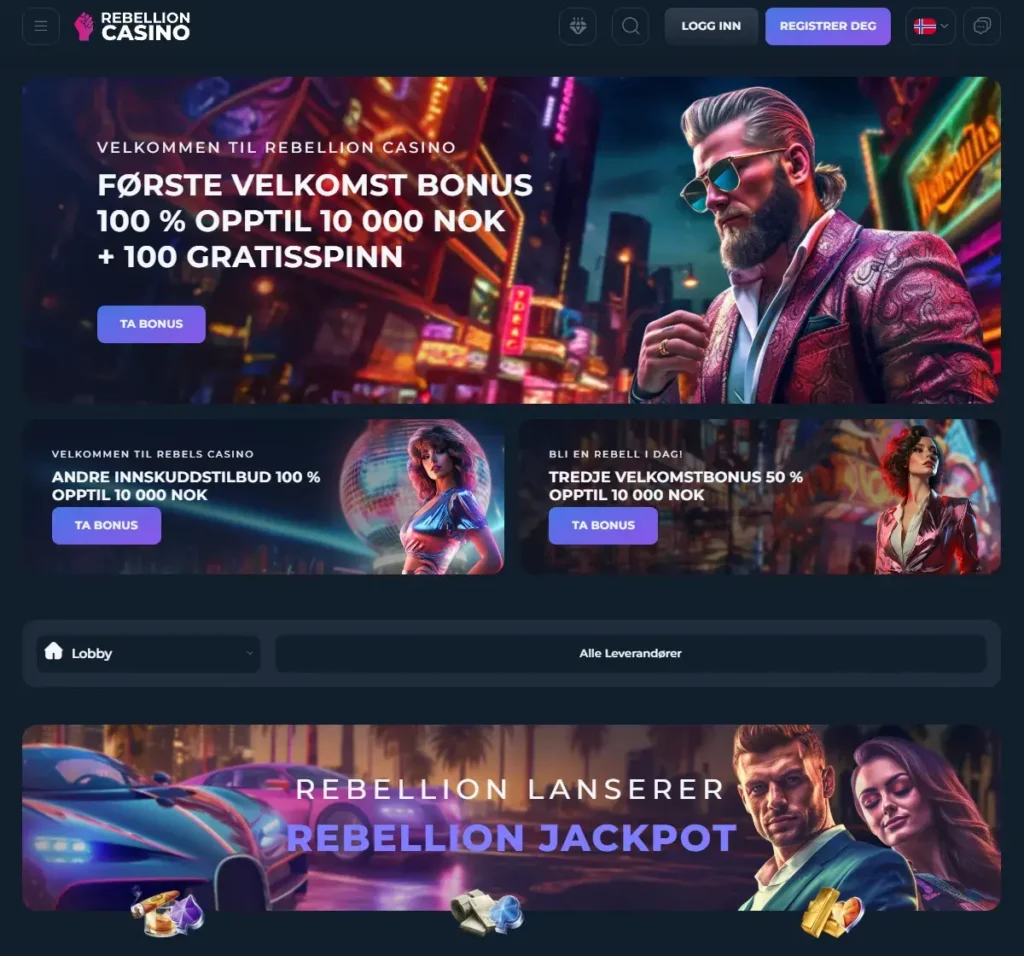 Velkommen til Rebellion Casino, din nyeste favorittdestinasjon for norske jackpot spill online! Lansert i 2023, står dette casinoet klart til å ta spillverdenen med storm med sitt imponerende utvalg av over 4000 casinospill. Hos Rebellion kan du dykke inn i en verden av muligheter hvor store gevinster venter rundt hvert hjørne.