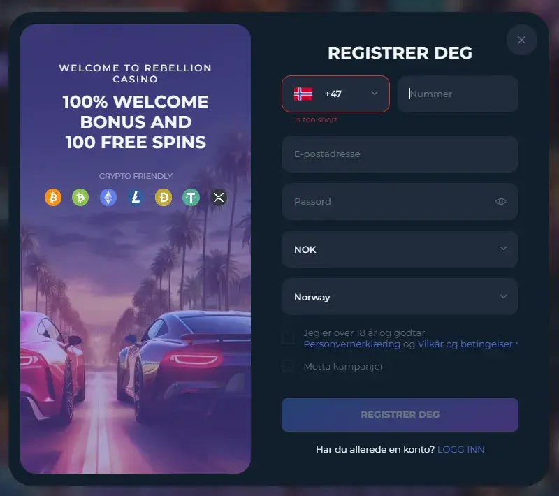 Det er enkelt å lage en konto hos Rebellion Casino, så bare følg trinnene her: